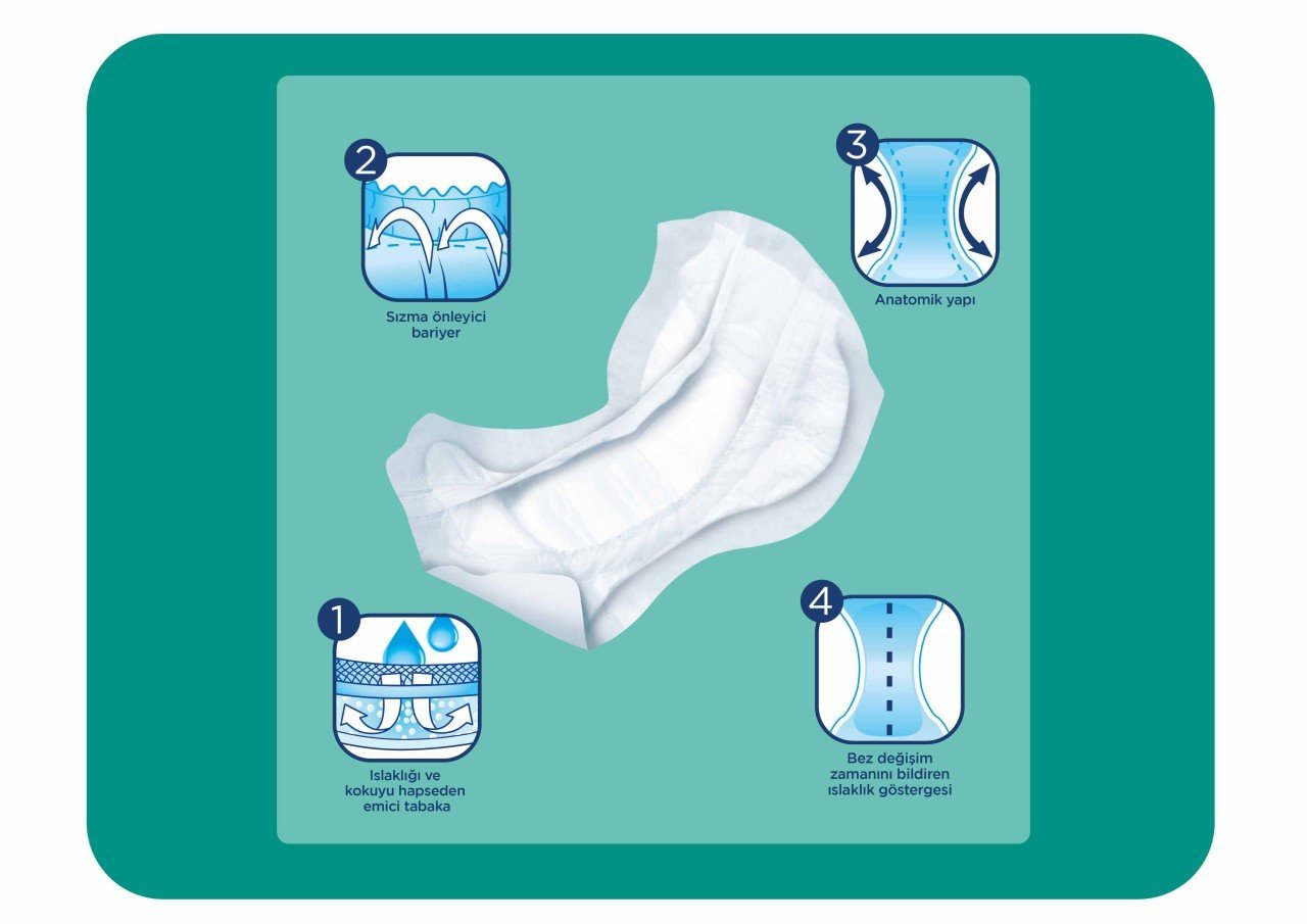 - Emici tabakası ile idrar kaçırma problemi olan hastaların kendilerini güvende hissetmelerini sağlar.