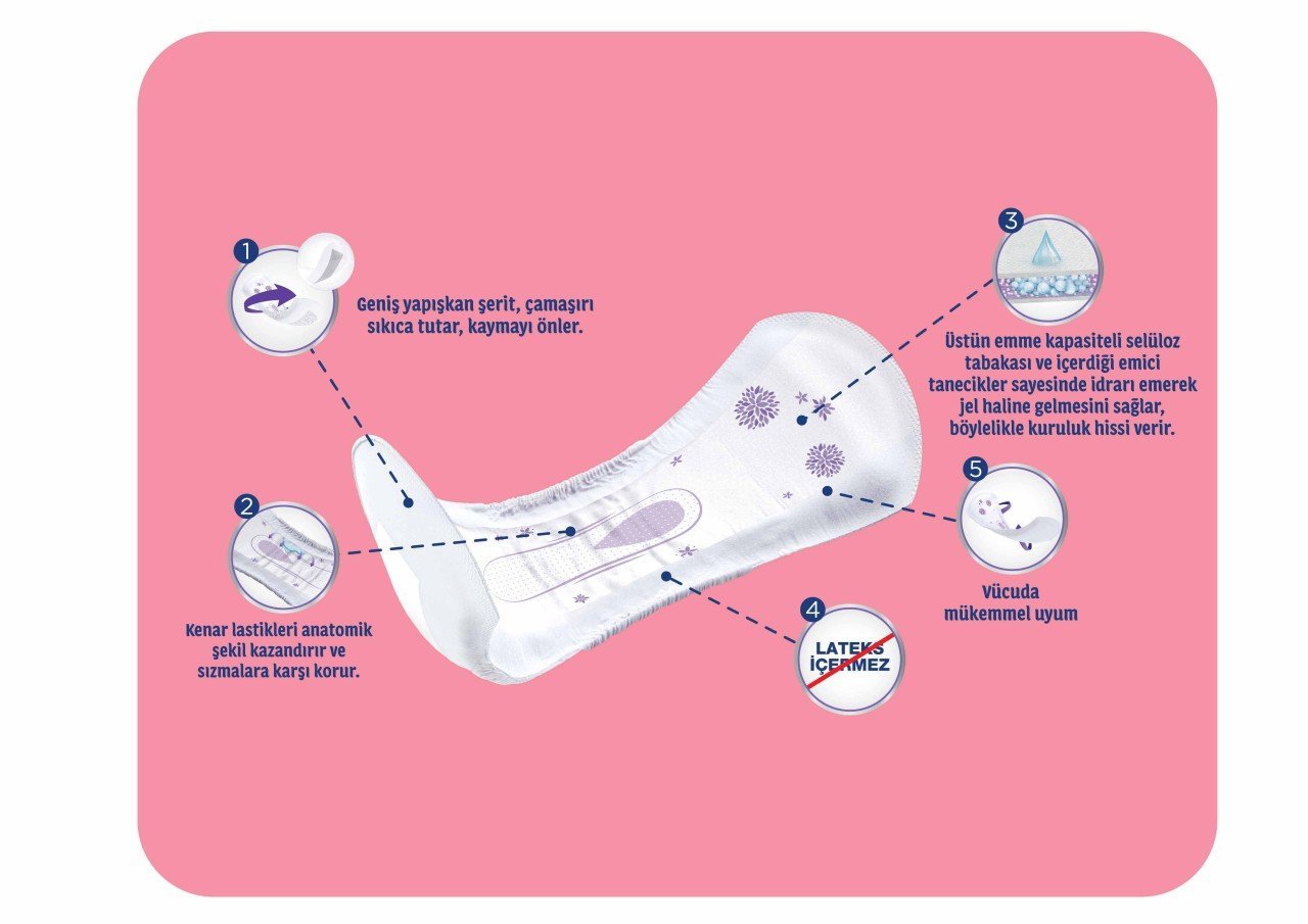 - Benzersiz tasarımıyla idrar kaçırma şikayeti olan kadınlar için daha ince, daha emici ultra mesane pedi;